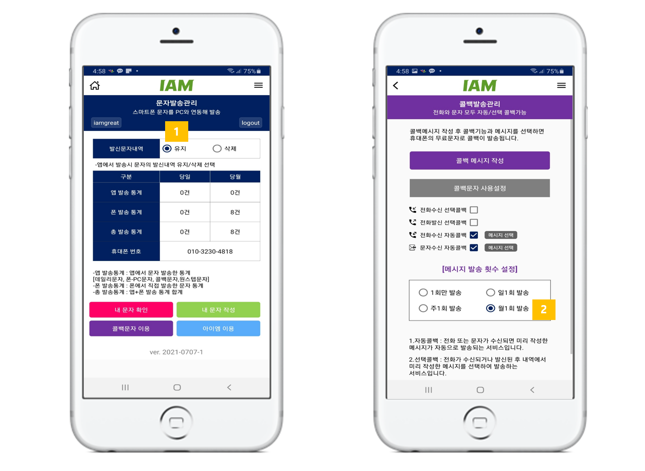2. 문자발송과 콜백발송 기본설정이 변경되었습니다.