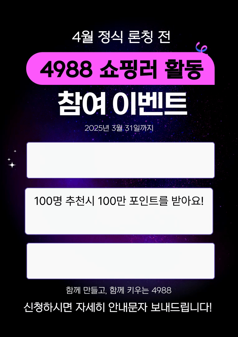 4월 론칭을 앞두고 4988에서 회원가입과 추천 활동 이벤트를 진행합니다. 회원가입만 해도 3만P 받고, 추천할 때마다 1만P 받을 수 있습니다. 포인트를 현금으로 출금도 가능해요! 많은 참여 부탁드려요~~~